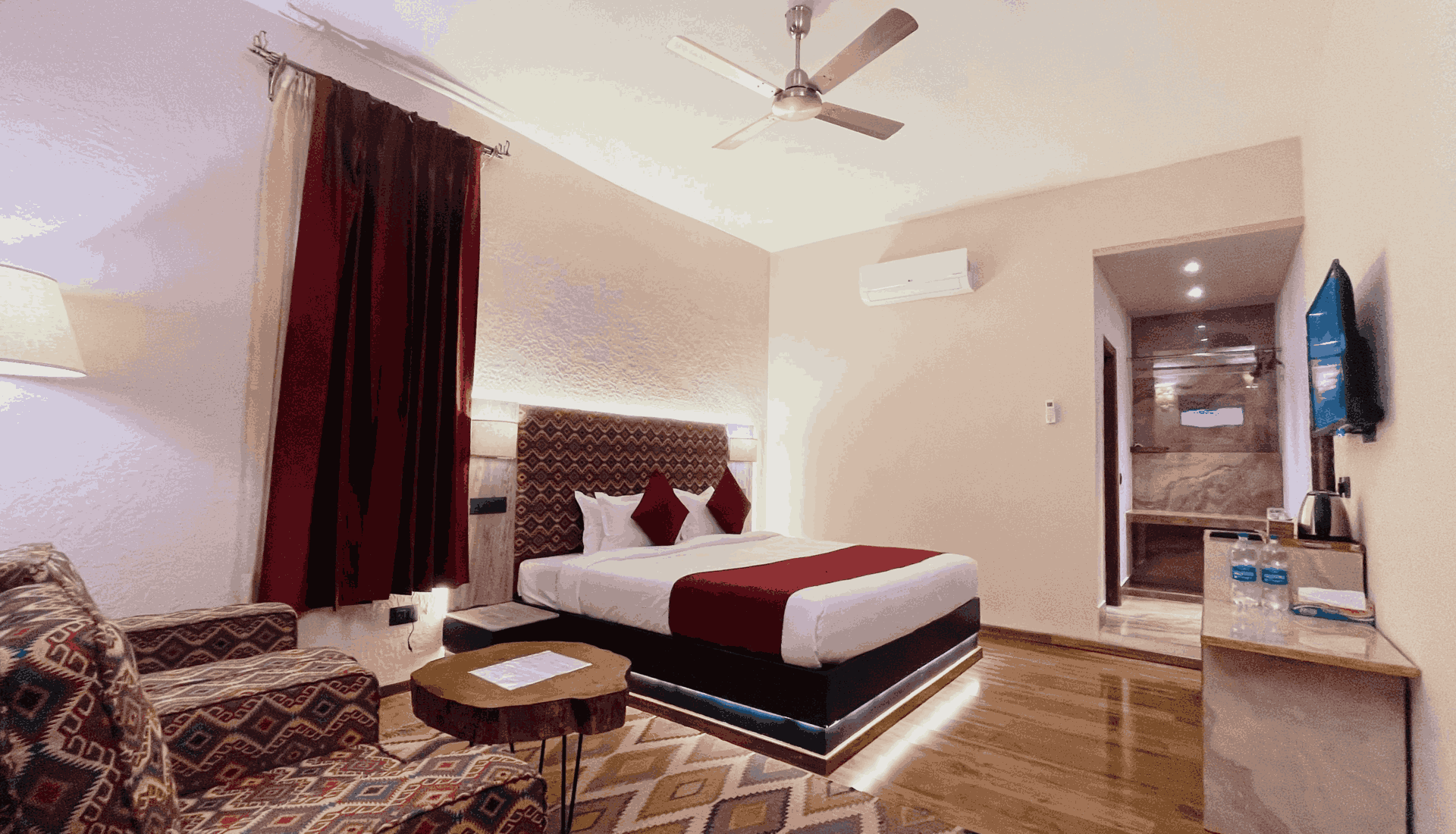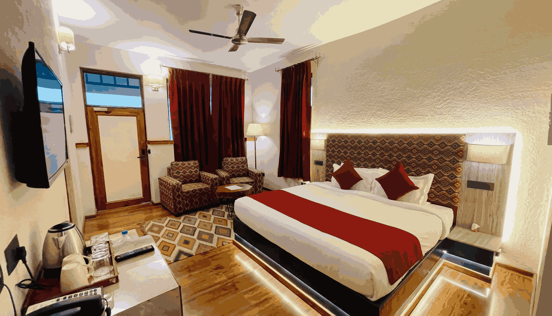 Our intricately designed Deluxe Nests offer a pleasing garden or balcony view and are spread over an area of 400 sq. ft., with wooden-floored interiors and a décor that beautifully blends old-school heritage with contemporary opulence, these rooms are decked with modern amenities, a king size bed, a richly upholstered sofa set, a classic writing desk, walk-in open closet and handmade rugs to ensure optimum comfort and a surreal escapade at our resort in Dharamshala!